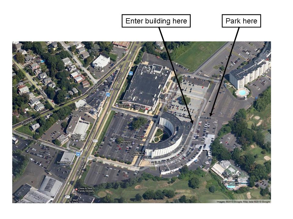 We are located on the ground floor of the semi-circular building in the photo. Drive around back and park where indicated. There is a back door at the corner of the building, adjacent to the parking garage, which is the closest entrance to the bridge club.